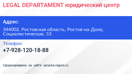 LEGAL DEPARTAMENT, юридический центр по адресу 344002, Ростовская область, Ростов-на-Дону, Социалистическая, 53 в дальнейшем Организация, размещена в следующих категориях:
