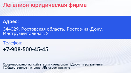 Легалион, юридическая фирма по адресу 344029, Ростовская область, Ростов-на-Дону, Инструментальная, 2 в дальнейшем Организация, размещена в следующих категориях: