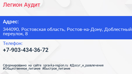 Легион-Аудит по адресу 344090, Ростовская область, Ростов-на-Дону, Доблестный переулок, 8 в дальнейшем Организация, размещена в следующих категориях: