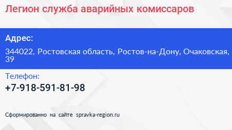 Легион, служба аварийных комиссаров по адресу 344022, Ростовская область, Ростов-на-Дону, Очаковская, 39 в дальнейшем Организация, размещена в следующих категориях: