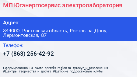 МП Югэнергосервис, электролаборатория по адресу 344000, Ростовская область, Ростов-на-Дону, Лермонтовская, 87 в дальнейшем Организация, размещена в следующих категориях: