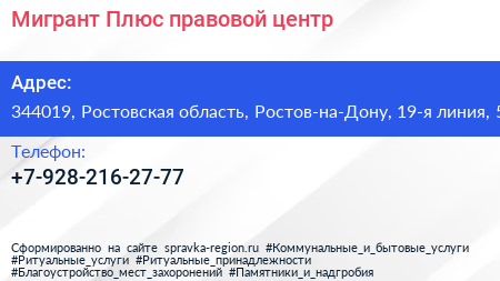 Мигрант Плюс, правовой центр по адресу 344019, Ростовская область, Ростов-на-Дону, 19-я линия, 5 в дальнейшем Организация, размещена в следующих категориях: