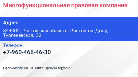 Многофункциональная правовая компания по адресу 344002, Ростовская область, Ростов-на-Дону, Тургеневская, 32 в дальнейшем Организация, размещена в следующих категориях: