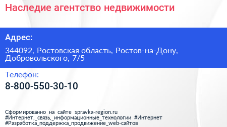 Наследие, агентство недвижимости по адресу 344092, Ростовская область, Ростов-на-Дону, Добровольского, 7/5 в дальнейшем Организация, размещена в следующих категориях: