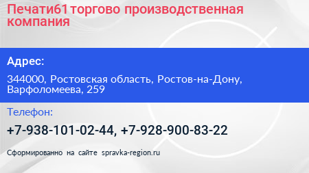 Печати61, торгово-производственная компания по адресу 344000, Ростовская область, Ростов-на-Дону, Варфоломеева, 259 в дальнейшем Организация, размещена в следующих категориях: