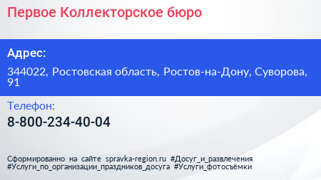 Первое Коллекторское бюро по адресу 344022, Ростовская область, Ростов-на-Дону, Суворова, 91 в дальнейшем Организация, размещена в следующих категориях: