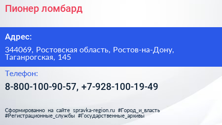 Пионер, ломбард по адресу 344069, Ростовская область, Ростов-на-Дону, Таганрогская, 145 в дальнейшем Организация, размещена в следующих категориях:
