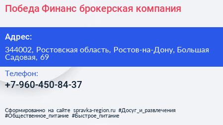 Победа Финанс, брокерская компания по адресу 344002, Ростовская область, Ростов-на-Дону, Большая Садовая, 69 в дальнейшем Организация, размещена в следующих категориях: