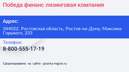 Победа финанс, лизинговая компания по адресу 344022, Ростовская область, Ростов-на-Дону, Максима Горького, 233 в дальнейшем Организация, размещена в следующих категориях: