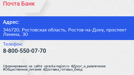 Почта Банк по адресу 346720, Ростовская область, Ростов-на-Дону, проспект Ленина, 30 в дальнейшем Организация, размещена в следующих категориях: