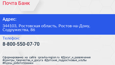 Почта Банк по адресу 344103, Ростовская область, Ростов-на-Дону, Содружества, 86 в дальнейшем Организация, размещена в следующих категориях: