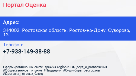 Портал Оценка по адресу 344002, Ростовская область, Ростов-на-Дону, Суворова, 13 в дальнейшем Организация, размещена в следующих категориях: