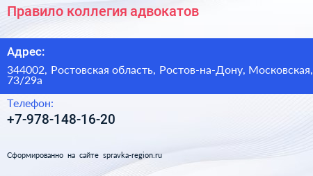 Правило, коллегия адвокатов по адресу 344002, Ростовская область, Ростов-на-Дону, Московская, 73/29а в дальнейшем Организация, размещена в следующих категориях: