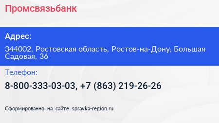 Промсвязьбанк по адресу 344002, Ростовская область, Ростов-на-Дону, Большая Садовая, 36 в дальнейшем Организация, размещена в следующих категориях: