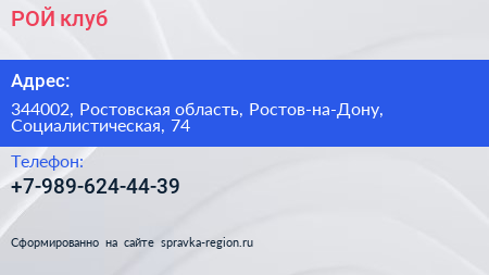 РОЙ, клуб по адресу 344002, Ростовская область, Ростов-на-Дону, Социалистическая, 74 в дальнейшем Организация, размещена в следующих категориях: