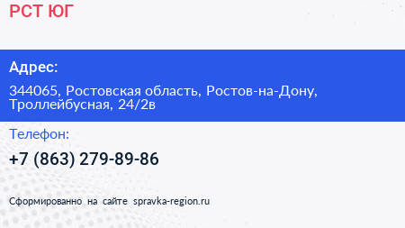 РСТ ЮГ по адресу 344065, Ростовская область, Ростов-на-Дону, Троллейбусная, 24/2в в дальнейшем Организация, размещена в следующих категориях: