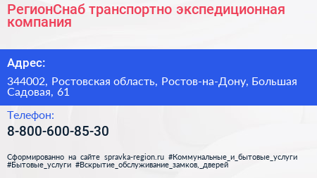 РегионСнаб, транспортно-экспедиционная компания по адресу 344002, Ростовская область, Ростов-на-Дону, Большая Садовая, 61 в дальнейшем Организация, размещена в следующих категориях: