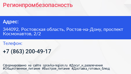 Регионпромбезопасность по адресу 344092, Ростовская область, Ростов-на-Дону, проспект Космонавтов, 2/2 в дальнейшем Организация, размещена в следующих категориях: