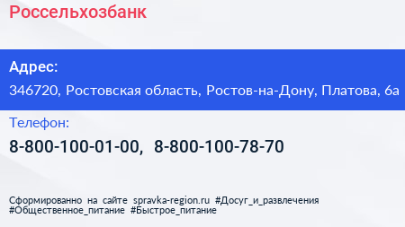 Россельхозбанк по адресу 346720, Ростовская область, Ростов-на-Дону, Платова, 6а в дальнейшем Организация, размещена в следующих категориях: