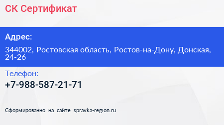 СК-Сертификат по адресу 344002, Ростовская область, Ростов-на-Дону, Донская, 24-26 в дальнейшем Организация, размещена в следующих категориях: