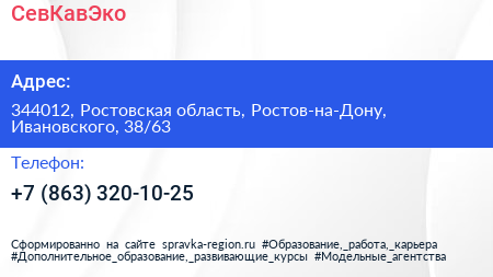 СевКавЭко по адресу 344012, Ростовская область, Ростов-на-Дону, Ивановского, 38/63 в дальнейшем Организация, размещена в следующих категориях: