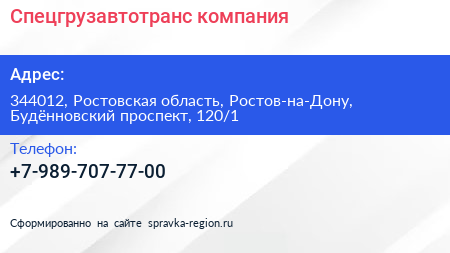 Спецгрузавтотранс, компания по адресу 344012, Ростовская область, Ростов-на-Дону, Будённовский проспект, 120/1 в дальнейшем Организация, размещена в следующих категориях: