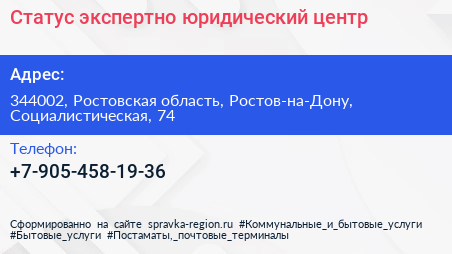 Статус, экспертно-юридический центр по адресу 344002, Ростовская область, Ростов-на-Дону, Социалистическая, 74 в дальнейшем Организация, размещена в следующих категориях: