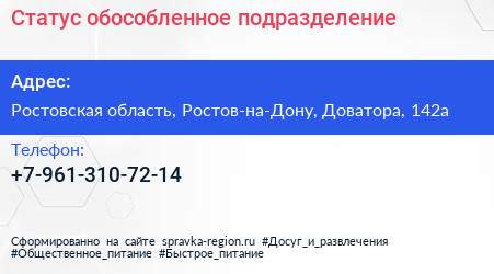 Статус, обособленное подразделение по адресу Ростовская область, Ростов-на-Дону, Доватора, 142а в дальнейшем Организация, размещена в следующих категориях: