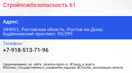 Стройпожбезопасность-61 по адресу 344011, Ростовская область, Ростов-на-Дону, Будённовский проспект, 93/295 в дальнейшем Организация, размещена в следующих категориях: