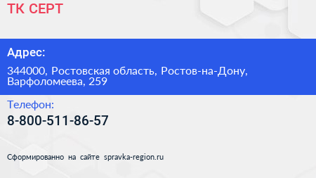 ТК СЕРТ по адресу 344000, Ростовская область, Ростов-на-Дону, Варфоломеева, 259 в дальнейшем Организация, размещена в следующих категориях: