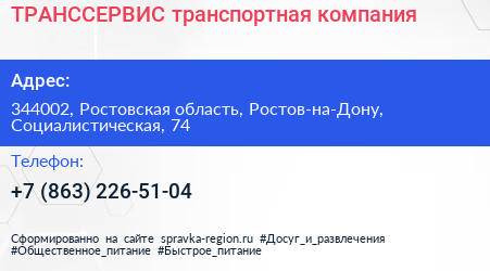 ТРАНССЕРВИС, транспортная компания по адресу 344002, Ростовская область, Ростов-на-Дону, Социалистическая, 74 в дальнейшем Организация, размещена в следующих категориях: