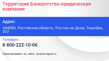 Территория Банкротства, юридическая компания по адресу 344000, Ростовская область, Ростов-на-Дону, Текучёва, 207 в дальнейшем Организация, размещена в следующих категориях: