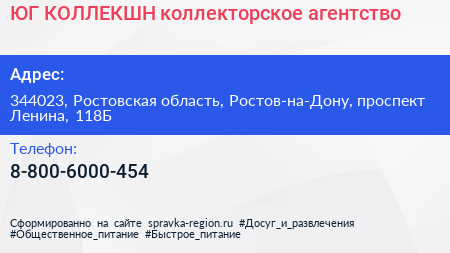 ЮГ-КОЛЛЕКШН, коллекторское агентство по адресу 344023, Ростовская область, Ростов-на-Дону, проспект Ленина, 118Б в дальнейшем Организация, размещена в следующих категориях: