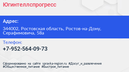 Югинтеллспрогресс по адресу 344002, Ростовская область, Ростов-на-Дону, Серафимовича, 58а в дальнейшем Организация, размещена в следующих категориях: