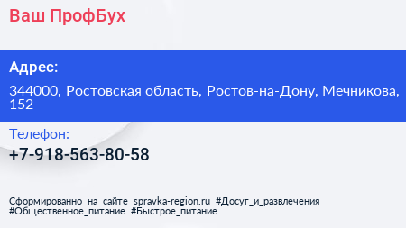Ваш ПрофБух по адресу 344000, Ростовская область, Ростов-на-Дону, Мечникова, 152 в дальнейшем Организация, размещена в следующих категориях: