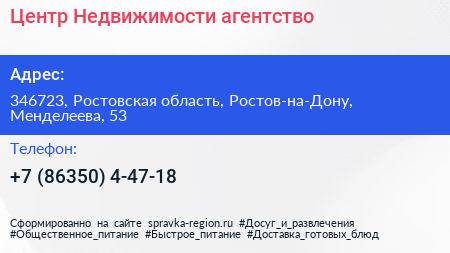 Центр Недвижимости, агентство по адресу 346723, Ростовская область, Ростов-на-Дону, Менделеева, 53 в дальнейшем Организация, размещена в следующих категориях: