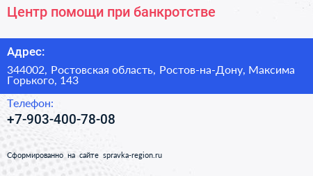 Центр помощи при банкротстве по адресу 344002, Ростовская область, Ростов-на-Дону, Максима Горького, 143 в дальнейшем Организация, размещена в следующих категориях: