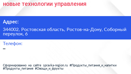 новые технологии управления по адресу 344002, Ростовская область, Ростов-на-Дону, Соборный переулок, 6 в дальнейшем Организация, размещена в следующих категориях: