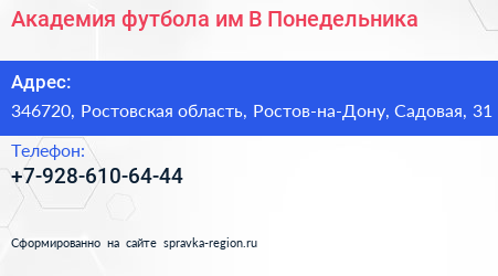 Академия футбола им. В. Понедельника по адресу 346720, Ростовская область, Ростов-на-Дону, Садовая, 31 в дальнейшем Организация, размещена в следующих категориях: