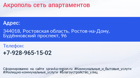 Акрополь, сеть апартаментов по адресу 344018, Ростовская область, Ростов-на-Дону, Будённовский проспект, 96 в дальнейшем Организация, размещена в следующих категориях: