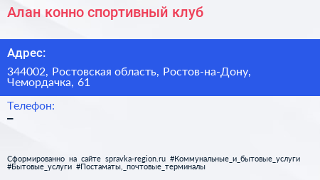 Алан, конно-спортивный клуб по адресу 344002, Ростовская область, Ростов-на-Дону, Чемордачка, 61 в дальнейшем Организация, размещена в следующих категориях: