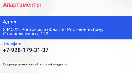 Апартаменты по адресу 344022, Ростовская область, Ростов-на-Дону, Станиславского, 122 в дальнейшем Организация, размещена в следующих категориях: