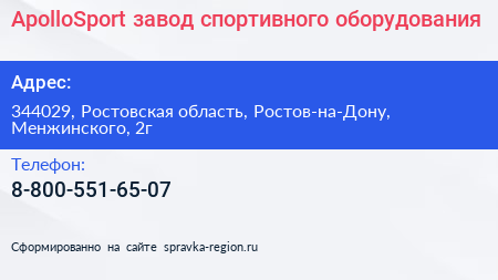 ApolloSport, завод спортивного оборудования по адресу 344029, Ростовская область, Ростов-на-Дону, Менжинского, 2г в дальнейшем Организация, размещена в следующих категориях:
