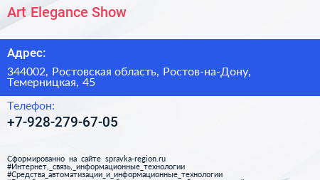 Art Elegance Show по адресу 344002, Ростовская область, Ростов-на-Дону, Темерницкая, 45 в дальнейшем Организация, размещена в следующих категориях: