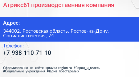Атрикс61, производственная компания по адресу 344002, Ростовская область, Ростов-на-Дону, Социалистическая, 74 в дальнейшем Организация, размещена в следующих категориях: