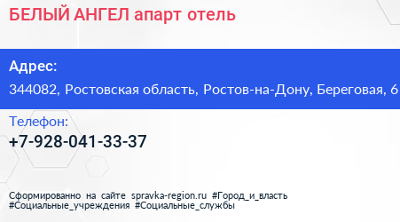 БЕЛЫЙ АНГЕЛ, апарт-отель по адресу 344082, Ростовская область, Ростов-на-Дону, Береговая, 6 в дальнейшем Организация, размещена в следующих категориях: