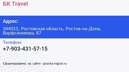 БК Travel по адресу 344011, Ростовская область, Ростов-на-Дону, Варфоломеева, 87 в дальнейшем Организация, размещена в следующих категориях: