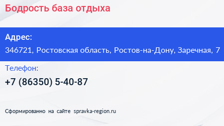 Бодрость, база отдыха по адресу 346721, Ростовская область, Ростов-на-Дону, Заречная, 7 в дальнейшем Организация, размещена в следующих категориях: