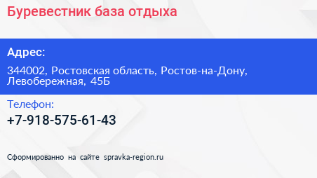 Буревестник, база отдыха по адресу 344002, Ростовская область, Ростов-на-Дону, Левобережная, 45Б в дальнейшем Организация, размещена в следующих категориях: