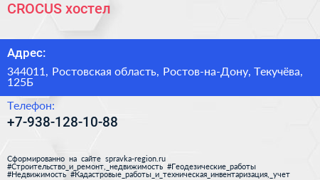 CROCUS, хостел по адресу 344011, Ростовская область, Ростов-на-Дону, Текучёва, 125Б в дальнейшем Организация, размещена в следующих категориях: